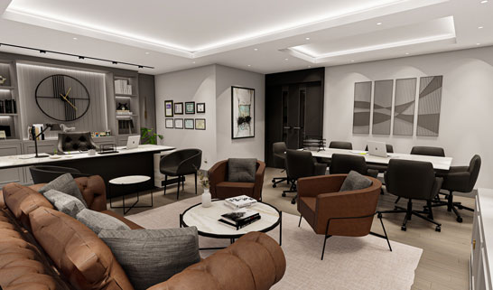 The manager's office highlights leadership atmosphere by combining functionality and comfort. Modern lighting solutions and bespoke furniture make this area standout with brand value and prestige..