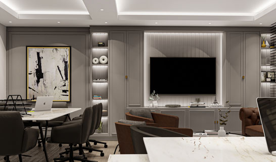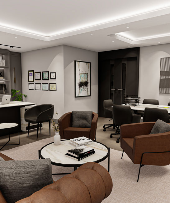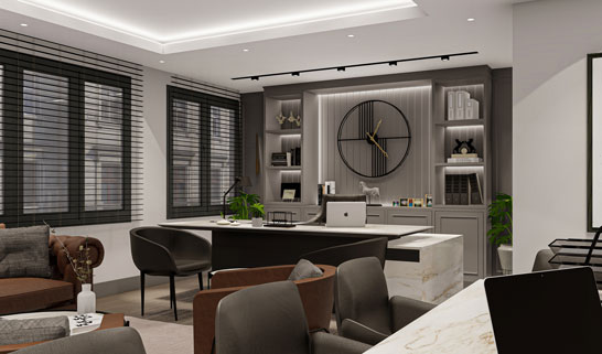 The manager's office highlights leadership atmosphere by combining functionality and comfort. Modern lighting solutions and bespoke furniture make this area standout with brand value and prestige..